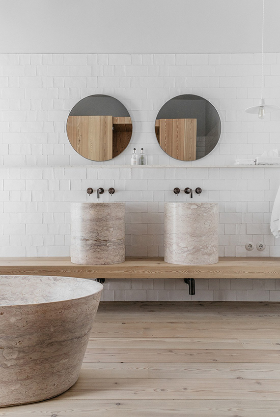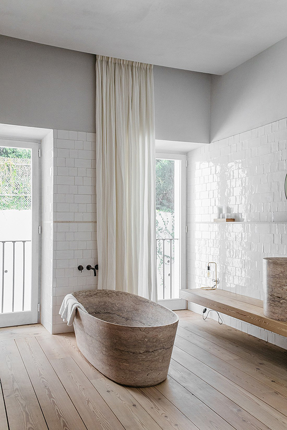 Isn’t this bathroom with a free standing stone bathtub stunning?! It is part of Santa Clara 1978, a guest house located in a beautiful 18th century building in the old cultural quarter of Lisbon (Portugal).